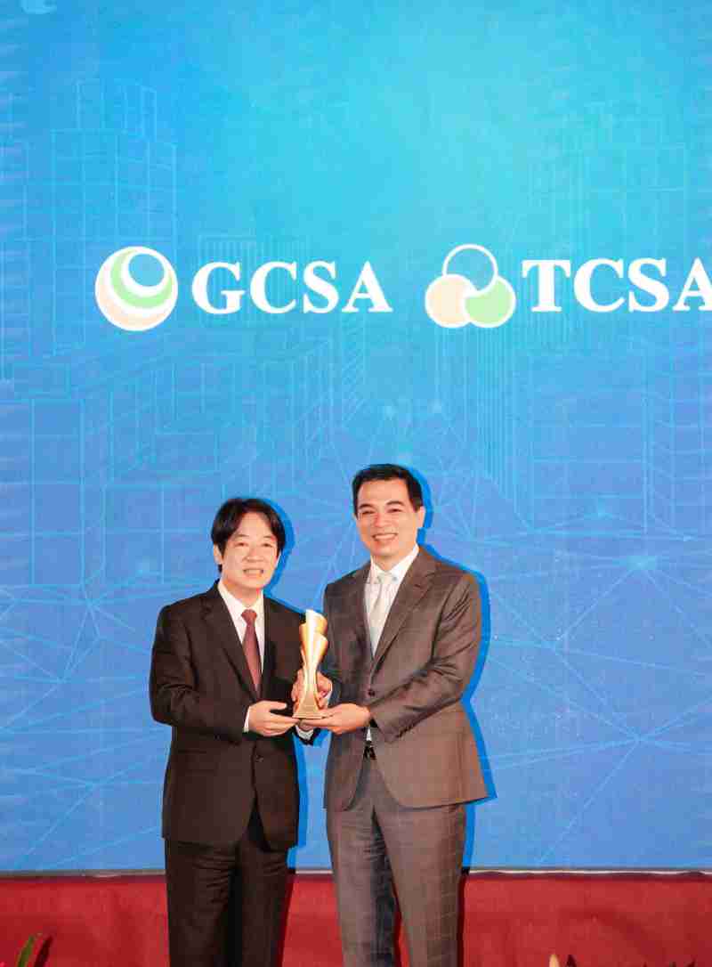 达全方位永续表现获全球永续奖及台湾永续奖肯定,,由副总统赖清德颁奖 (左),,,,开云电子总经理柯富仁 (右) 代表领奖