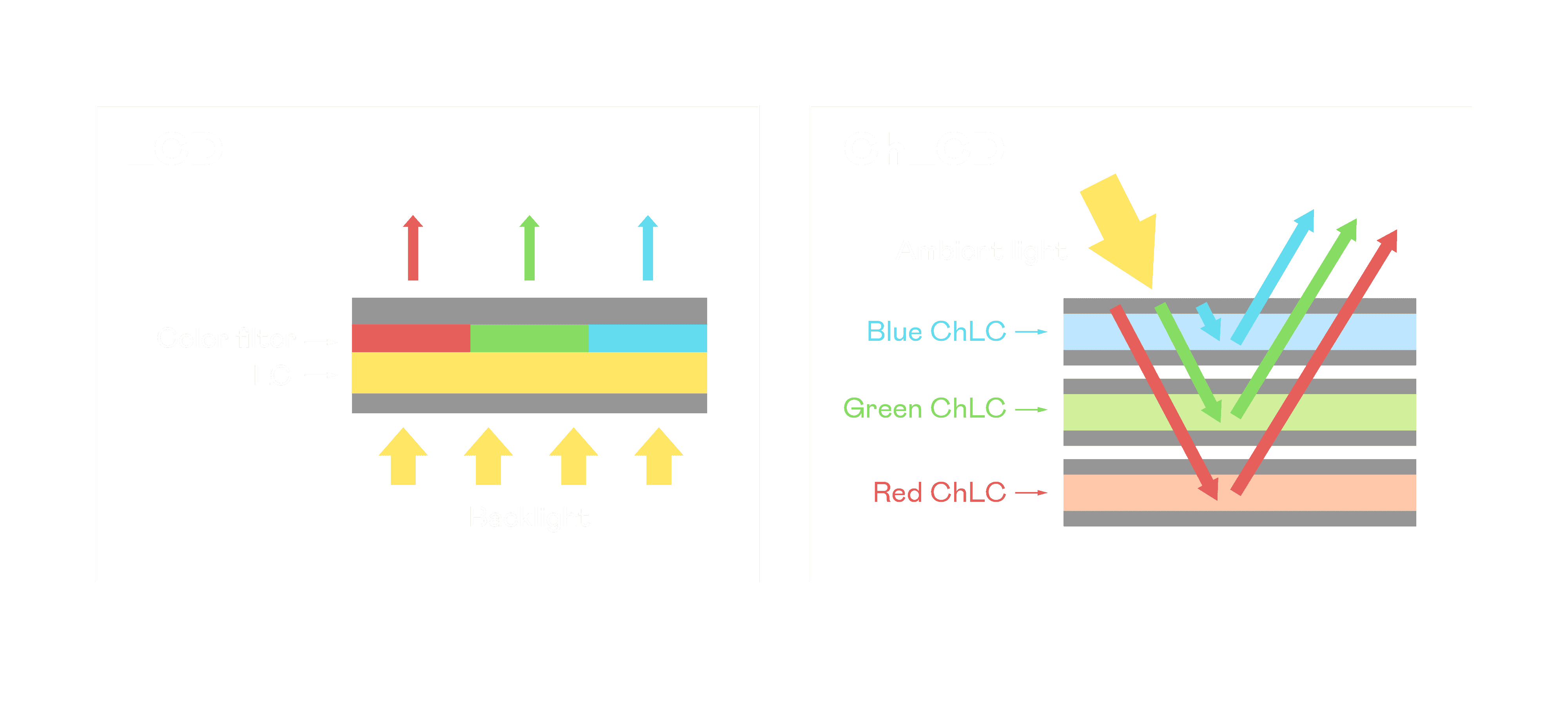 开云电子胆固醇液晶显示器是由红、、、绿、、、蓝三层胆固醇液晶面板堆叠而成,,,,并采用无彩色滤光片设计,,,,减少环境光在反射过程中的损耗。。。